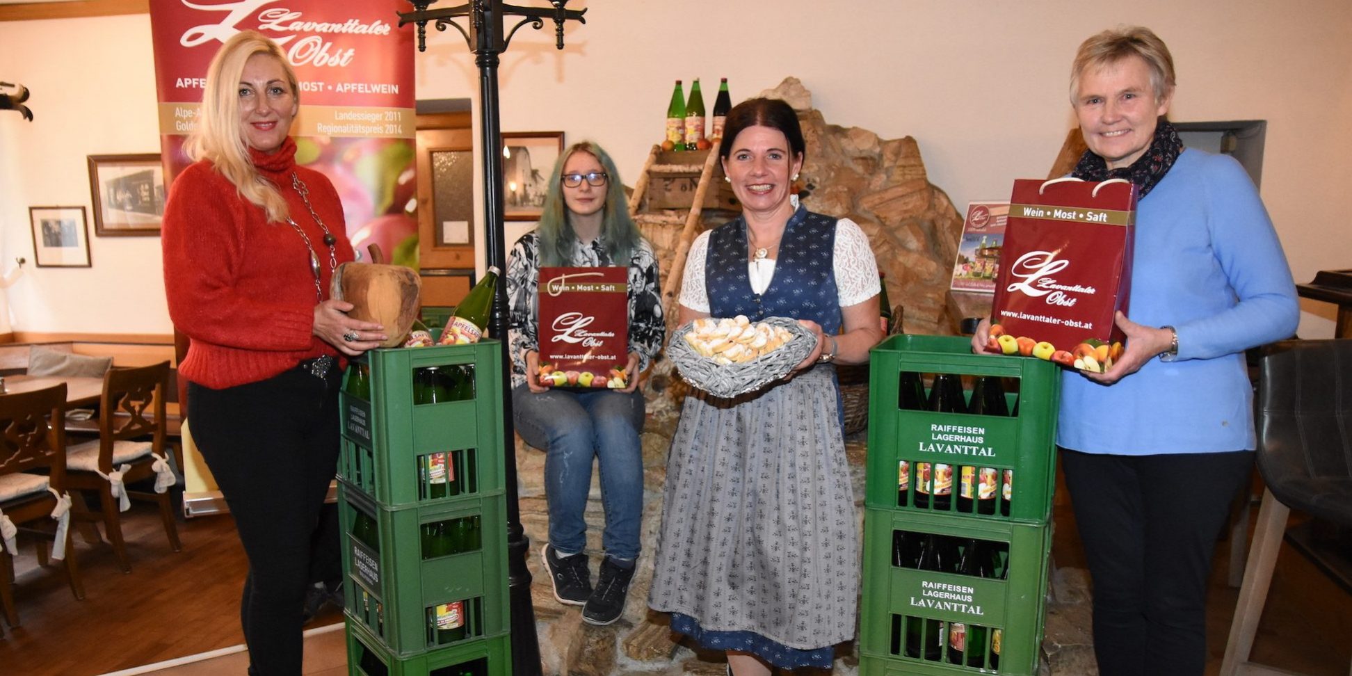 2 x 60 Flaschen Lavanttaler Saft gab es beim Oktober-Gewinnspiel von best of Murau Murtal zu gewinnen. Über den fruchtigen Gewinn durften sich Martina Maierhofer (rechts) und Rebecca Kaßmannhuber (zweite von links) freuen. Rosita Radl-Jöbstl von Lavanttaler Obst (links) und Sonja Wieser vom Gasthof Wieser (zweite von rechts) überreichten den Gewinnerinnen die Preise. Der Saft stammt von rund 1.500 Bauern und weiteren 2.000 Hausgartenbesitzern aus dem Lavanttal und angrenzenden Regionen und wird in Wolfsberg mit modernster Press- und Kellereitechnik zu hochwertigen sortenreinen Fruchtsäften verarbeitet.